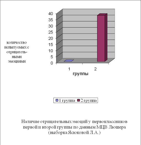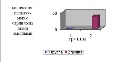 1 группа – это испытуемые с низкой ригидностью по данным ТОРЗ. 2 группа – это испытуемые с высокой ригидностью по данным ТОРЗ. Эти испытуемые неспособны при объективной необходимости изменить мнение, отношение, установку, мотивы, модус переживания, в состоянии страха, стресса, плохого настроения, утомления или болезни в высокой степени склонны к ригидному поведению. В обычных условиях такого поведения они могут не проявлять. По результатам методики цветовых выборок Люшера в адаптации Собчик, испытуемые 1 группы, как видно на рис.2. на первую позицию в цветовом ряду ставят синий цвет. Рис.2. Частота предпочитаемого цвета 1 группы. Этот цвет предпочитают чувствительные, впечатлительные, спокойные и уравновешенные дети. Они отличаются утонченностью и хорошим эстетическим развитием, состояние грусти и печали является для них приятным эмоциональным переживанием. Они имеют потребность в глубоком личном, а не поверхностном игровом общении. В данной группе прослеживается неустойчивость черного цвета. На последнюю позицию ставят фиолетовый цвет, что свидетельствует о возможном страхе, чувстве бесперспективности, которое может скрываться от окружающих или проявляться в виде негативизма. На рис.3. видно, что испытуемые второй группы на первое место ставят фиолетовый цвет. Рис.3 Частота предпочитаемого цвета 2 группы Что свидетельствует о доминировании инфантильной установки. Эти дети не чувствуют ответственности, не готовы преодолевать учебные трудности, ходят в школу в основном, чтобы весело проводить время, играть, общаться с одноклассниками. Таким детям нравится в школе, когда там бывает интересно и когда их там хвалят. Если возникают трудности они могут капризничать, устраивать истерики, отказываться идти в школу. Ведущая роль фиолетового цвета связана с затрудненной социальной адаптацией через общее ослабление интегративной роли самосознания, неумение использовать накопленный опыт. На последнее место ставят черный цвет, что указывает на сопротивление подчинению, на стремление уйти от стесняющих запретов, на переживания по поводу равнодушия к ним взрослых. В 1 и во 2 группах происходит отвергание коричневого цвета, что говорит о стремлении произвести впечатление на взрослых и сверстников в сфере значимых межличностных контактов. По результатам методике Люшера мы отметили выборку по Ясюковой Л.А. о наличии в данных группах отрицательных эмоций. На рис.4. видно, что в 1 группе, как норме, не отмечены отрицательные эмоции (0%). Данные испытуемые веселы, счастливы, настроены оптимистично, пребывают в состоянии эйфории.