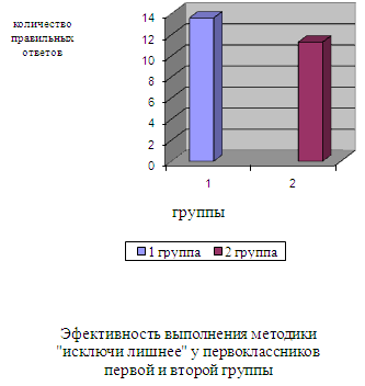 Рис. 7. Эффективность выполнения методики «исключи лишнее» По результатам методике «Исключи лишнее» (рис.7.) результаты первой группы выше (13,6%) чем у второй группы (11,31%), что говорит о способности к обобщению и абстрагированию и умению выделять существенные признаки.