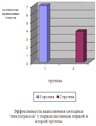 Рис. 8. Эффективность выполнения методики «пиктограмма» По методике «Пиктограмма» (рис.8.) были получены следующие результаты: у испытуемых первой группы результаты выше (7%) чем у второй группы (3,8%), что свидетельствует о большем развитии опосредованного запоминания и его продуктивности.