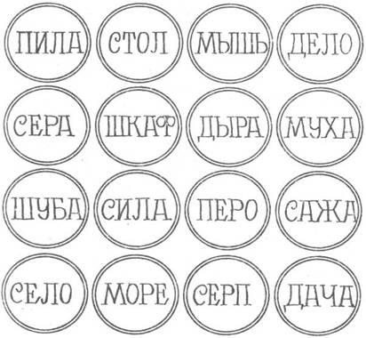 Рис.1. Планшет и расположенные на нем картонные кружки со словами Эксперимент проводится в затемненной комнате так, чтобы испытуемый хорошо видел границы планшета, и месторасположение на нем каждого кружка, однако не видел написанных на кружках слов, У экспериментатора имеется фонарик, на светящуюся часть которого надета картонная трубочка, - так, чтобы при направлении луча на планшет хорошо освещался лишь один кружочек и свободно прочитывалось написанное на нем слово, но в то же время все другие кружки оставались затемненными и находящиеся на них слова не могли быть прочитаны. Экспериментатор, перемещая фонарик, по очереди освещает кружки со словами. Продолжительность освещения каждого слова - 2с. Затем фонарик сразу же направляется на следующее слово. Последовательность освещения кружков случайна, однако она остается неизменной на протяжении всего эксперимента. Эксперимент включает в себя три серии, которые проводятся с разным составом испытуемых. Серии отличаются одна от другой содержанием задачи, поставленной перед испытуемым. Инструкция испытуемому состоит из двух частей. Первая часть общая для всех серий эксперимента. Вторая - специфическая для каждой серии. Общая часть инструкции: "Перед вами планшет, на котором лежат кружки с написанными на них словами. Слова будут по очереди, по одному, освещаться световым зайчиком. Вы должны все освещенные слова прочитывать вслух". Далее в первой серии предлагается: "При этом снимайте с доски те кружки, которые будут указывать дополнительно при помощи указки". Освещая кружки, экспериментатор к некоторым из них прикасается указкой, они и подлежат снятию. Выбирается 6 таких кружков; они должны быть случайным образом и равномерно распределены по местоположению на планшете и чередоваться без какой-либо закономерности с остальными кружками, например: 1) шкаф, 2) .сажа, 3) село, 4) мышь (+)1, 5) море (+), 6) пила, 7) муха (+), 8) серп, 9) шуба (+), 10) сила, 11) дыра, 12) дача, 13) стол, 14) сера (+), 15) дело (+), 16) перо. Во второй серии предлагается: "При этом снимайте все кружки, на которых слова начинаются с буквы "С", Таких слов также 6 и они также случайным образом "рассыпаны" по планшету. (Знак (+) рядом со словом обозначает, что это слово фиксируется указкой экспериментатора и карточка подлежит снятию). В третьей серии испытуемому указывается: «При этом определите, на какую букву начинается больше всего слов». Такой буквой является «С» (6 слов); на другие начальные буквы (М, Д, П, Ш) приходится по 2-3 слова. При выполнении задания первой серии деятельность испытуемого направлена на учет лишь формальных признаков ситуации (появление указки), написанные же на карточках буквы не имеют никакого отношения к выполнению задачи. Во второй серии ориентировка испытуемого направлена на начальные буквы слов, однако к достижению цели приводит лишь фиксация буквы "С" в качестве начальной, другие же начальные буквы не имеют непосредственного отношения к выполнению задачи. В третьей серии предметом анализа испытуемого, особенно в начале выполнения задания, становятся все первые буквы слов, так как любая из них является "претендентом" на роль наиболее часто встречаемой и для ее определения необходимо удержание в памяти одновременно нескольких букв. После выполнения задания с испытуемым в течение 15 мин ведется беседа на посторонние темы