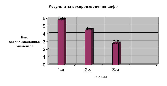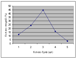 Рис. 6. Процентное соотношение воспроизводимости букв людьми Целенаправленный анализ числового ряда Методика направлена на изучение зависимости запоминания элементов, материала от степени их включенности в деятельность человека. Высокая включенность некоторых элементов в деятельность достигается постановкой перед испытуемым специальных познавательных задач, для решения которых ему необходимо осуществить целенаправленный анализ этих элементов. Низкая же включенность остальных элементов материала в деятельность обеспечивается тем, что по отношению к ним перед испытуемым ставятся лишь вспомогательные, не имеющие самостоятельного значения задачи. Все элементы имеют практически одинаковые объективные (физические и семантические) характеристики и постоянно находятся в поле восприятия испытуемого, выступая в качестве необходимого условия выполнения заданных познавательных действий. При обработке результатов определяется доля правильно воспроизведенных чисел, непосредственно включенных в деятельность испытуемых, и доли правильно воспроизведенных остальных чисел (например, если из четырех непосредственно включенных в деятельность чисел воспроизведено 3, а из остальных шести - 2, то доли равные соответственно 75 и 33%). Таблица 4. Воспроизведение чисел (по методике целенаправленный анализ числового ряда)