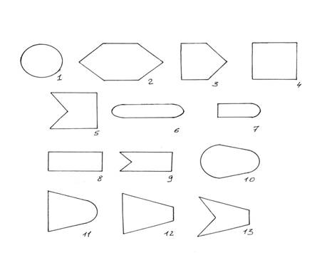 Рис.3. Предъявляемый набор геометрических фигур Эксперимент состоит из двух серий, которые проводятся с различными группами испытуемых. Серии отличаются друг от друга степенью содержательности способов действия испытуемых с предъявленными фигурами. В первой серии испытуемым предлагается осуществить классификацию фигур, разложив их на несколько групп. Инструкция испытуемому "Сейчас Вам будет предъявлено несколько фигур различной формы. Ваша задача - разложить их на несколько групп, т.е. расклассифицировать их. Внутри каждой группы должны оказаться фигуры, имеющие некоторый общий признак, такой, каким не обладают фигуры, оказавшиеся в других группах. Если Вы считаете, что можно произвести несколько различных классификаций, т.е. сперва выделить группы на основе одного какого-либо признака, затем разложить фигуры иначе, с учетом другого признака, то предложите несколько вариантов раскладки: сперва один, потом другой". Подавляющее большинство испытуемых справляется с этим заданием. Чаще других встречаются классификации по характеру линий в фигурах: прямые (2,3,4,5,8,9,12,13), кривые (1,6,10) и смешанные (7,11); по общему очертанию: правильные (1,2,3,4), удлиненные (6,7,8,9) и расширенные слева - суженные справа (10,11,12); по общим особенностям контура: округлые (1,6,7,10,11), угловатые (2,3,4,8,12) и "с вырезом" (5,9,13). Во второй серии испытуемым предлагается обнаружить ряды последовательных трансформаций-фигур пытаясь расположить их в виде схемы таким образом, что бы каждая последующая фигура отличалась от предыдущей каким-либо небольшим изменением (итоговая схема представлена на рис.4;она не показывается испытуемому, испытуемый должен ее построить самостоятельно).