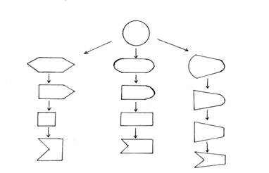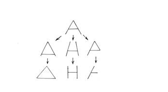 Рис.4. Схема последовательных трансформаций фигур Инструкция испытуемому: "Сейчас Вы увидите несколько различных фигур. Ваша задача - внимательно рассмотреть их, сопоставляя друг с другом, и постараться выделить несколько "цепочек" из этих фигур, построенных так, что каждая последующая фигура лишь немного отличается от предыдущей (представляет собой небольшое ее видоизменение), т.е. каждая пара соседних фигур сходна друг с другом, Например, пусть у нас имеется исходная фигура - буква А. Последовательные изменения ее могут состоять в следующем (далее показывается бланк со схемой, изображенной на рис.5): в опускании; горизонтальной черточки; в выравнивании наклонных линий; в «обрезании» части фигуры справа (все называемые изменения показываются на схеме). Возможны и другие, более сложные изменения. Аналогичную схему Вам следует построить из этих фигур (выкладывается на стол набор карточек с фигурами). Вверху должна быть эта карточка (указывается на круг). Постарайтесь построить; как можно более четкую схему, с использованием всех имеющихся фигур".
