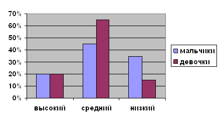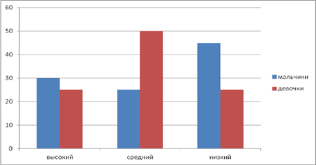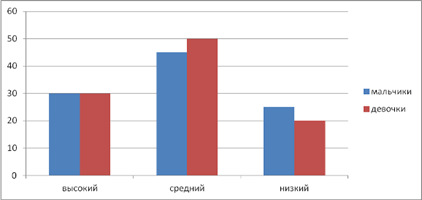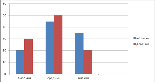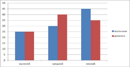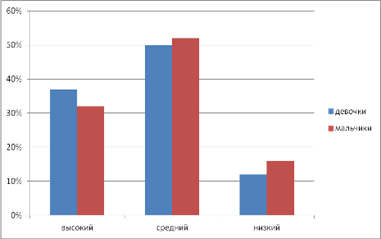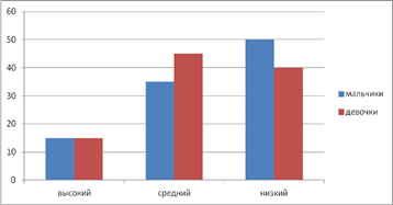 Рис. 2. Результаты исследования особенностей памяти у дошкольников по методике «Запоминание 10 слов» для мальчиков и девочек (способность к заучиванию, %) Как видно из рисунка 2, одинаковый процент мальчиков и девочек показали высокие результаты способности к заучиванию (15%). Процент девочек (45%) со средним уровнем развития этой способности значительно превышает процент мальчиков (35%). Процент мальчиков (50%) с низким уровнем развития способности к запоминанию оказался существенно выше, нежели в группе девочек (40%).