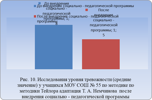 В ходе проведения социально – педагогической программы по работе социального педагога с личностью средний бал уровня тревожности для учащихся 1-4 классов МОУ СОШ № 55 удалось снизить с 8 до 5.(Рис. 10) Разработанная и апробированная нами социально – педагогическая программа деятельности с личностью, в части направленной на снижения уровня тревожности, может считаться эффективной.