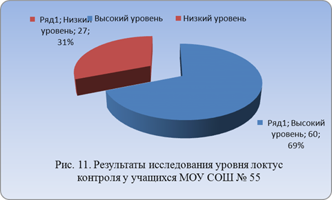 Одной из важных интегральных характеристик готовности к социальной активности является качество личности, получившее название локуса контроля. Появление этого понятия в психологической литературе связано с работами американского специалиста в области психодиагностики Дж. Ротгера (1982). Роттер вывел идею локуса контроля из своей концепции социального научения, в которой контроль определяется как стабильная склонность личности определенным образом оценивать причинность жизненных событий. Центральное место в концепции Ротгера отводится формированию в процессе социализации (социального научения) системы обобщенных ожиданий того, что определенное поведение приведет к вознаграждению и это вознаграждение имеет психологическую ценность в конкретнойситуации. В соответствии с особенностями ожиданий человек может формировать два типа стратегий взаимодействия с окружением, два типа локализации, или локуса контроля: штерналъныйи экстерналъный. В первом случае, планируя свою деятельность, принимая определенные решения, человек оценивает, насколько достижение поставленных им целей зависит от него лично, от его усилий и умений и являются закономерным результатом его собственной деятельности. Во втором случае, человек убежден, что его успехи или неудачи являются результатом таких внешних сил как везение, случайность, другие люди, то есть от неконтролируемых им сил. Любой индивид занимает определенную позицию на континууме, задаваемом этими полярными типами локуса контроля. Необходимо отметить, что теория локуса контроля позволила сформулировать положение о локусе контроля как о характеристике независимой от конкретных событий и ситуаций, с которыми приходится сталкиваться человеку. Исследователями выявлены многочисленные личностные корреляты локуса контроля. С целью определения локуса контроля в исследовании использовался анкетный опросник определения локуса контроля и самоконтроля поведения. Для нашего исследования данная методика позволяет дифференцировать испытуемых по уровню их субъективного контроля,т.е. выделить группу лиц с высоким уровнем локуса контроля (интернальность) и с низким уровнем локуса контроля (экстернальнооть). Данные полученные в ходе исследования представленные на рисунках 11. Учащиеся с высоким уровнем локуса контроля (интернальность) - 69%; с низким уровнем локуса контроля (экстернальнооть) – 31%. Отметим что экстернальность или интернальность личности оказывает заметное влияние на подход социального педагога к работе с данным клиентом.