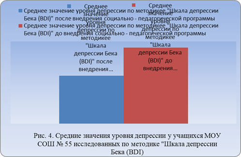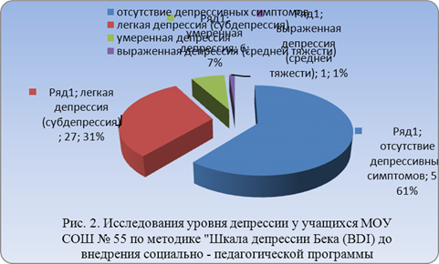 Далее используя методику "Шкала депрессии Бека (BDI) мы исследуем уровень депрессивности у учащихся СОШ МОУ № 55, на рис. 2 представлены результаты данного исследования (относительные величины)до внедрения социально - педагогической программы: отсутствие депрессивных симптомов – 61%; легкая депрессия (субдепрессия) – 31%; умеренная депрессия – 7%; выраженная депрессия (средней тяжести) – 1%.