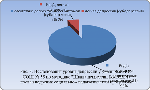 Проанализировав данные исследования полученные на третьем этапе исследования, представленные на рис. 3, отметим что после проведения тренинговых и игровых методик (использованных при внедрении социально - педагогической программы) уровень учащихся с легкойдепрессий (субдепрессия) снизился на 24 %, с умеренная депрессия также как и депрессией средней тяжести – снизился до 0%. То есть уровень учащихся 1-4 классов МОУ СОШ № 55 с отсутствием депрессивных синдромов вырос с 61% до 93%.