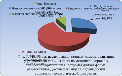 На рисунке 4 представлено средние значение уровня депрессии группы учащихся МОУ СОШ № 55 по методике по методике "Шкала депрессии Бека (BDI). В ходе проведения социально – педагогической программы по работе социального педагога с личностью (представленной в параграфе 3.3. выпускной квалификационной работы) средний бал уровня депрессии для учащихся 1-4 классов МОУ СОШ № 55 удалось снизить с 8 до 5. Из всего выше сказанного следует что, разработанная и апробированная нами социально – педагогическая программа деятельности с личностью, в части направленной на борьбу с депрессивными состояниями, может считаться эффективной. Далее используя методику"Опросник личностной ориентации Шострома (краткая форма, разработанная Джоунс и Крэндалл)"мы исследуем уровень самоактуализации у учащихся СОШ МОУ № 55, на рис. 5 представлены результаты данного исследования (относительные величины)до внедрения социально - педагогической программы: низкая степень самоактулизации – 28% учащихся; средняя степень самоактуализации – 64 %; высокая степень самоактуализации – 8%