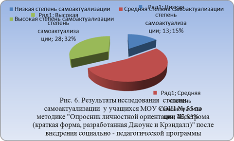Проанализировав данные полученные на третьем этапе исследования, представленные на рис. 5, 6, отметим что после проведения тренинговых и игровых методик (использованных при внедрении социально - педагогической программы) уровень учащихся с низкой степениюсамоактуализации снизился на 13%; со средней степенью на 11%, тогда как уровень учащихся с высокой степенью актуализации вырос на 24%.
