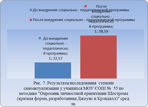 На рисунке 7 представлено средние значение уровня самоактуализаци для группы учащихся МОУ СОШ № 55 по методике ""Опросник личностной ориентации Шострома (краткая форма, разработанная Джоунс и Крэндалл)". В ходе проведения социально – педагогической программы по работе социального педагога с личностью (представленной в параграфе 3.3. выпускной квалификационной работы) средний бал уровня самоактуализации для учащихся 1-4 классов МОУ СОШ № 55 удалосьповысить с 32,57 до 38,59.