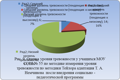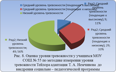 Используя методику измерения уровня тревожности Тейлора адаптация Т. А. Немчиновамы исследуем уровень тревожности у учащихся СОШ МОУ № 55, на рис. 8, 9 представлены результаты данного исследования (относительные величины) до внедрения социально - педагогической программы у 56% наблюдался низкий уровень тревожности; 33% средний уровень с тенденцией к низкому; у 11% средний с тенденцией к высокому. Отметим что после апробации и внедрения социально – педагогической программы уровень учащихся со средним уровнем тревожности (с тенденцией к низкому) и средним с тенденцией к высокому снизился на 17 и 4%, соответственно.