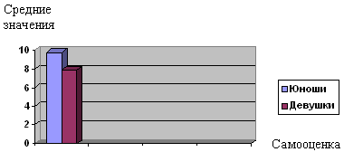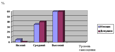 Рисунок №1. Соотношение средних значений уровня самооценки по «Методике изучения самооценки» у юношей и девушек. Из рисунка № 1 видно, что самооценка у юношей и девушек различается на уровне низкой и средней самооценки. У представительниц женского пола не намного преобладает средняя самооценка, в отличие от юношей. Также можем наблюдать, что у девушек низкая самооценка отсутствует вообще Однако, высокая самооценка одинакова как у юношей, так и у девушек.. Дальше мы можем проследить соотношение по каждому показателю по «Методике изучения самооценки» у представителей обоих полов.