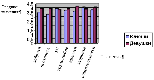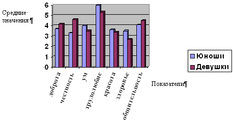 Рисунок № 2. Соотношение средних значений уровня самооценки по «Методике изучения самооценки» у юношей и девушек по каждому показателю. На рисунке № 2 мы можем проследить, что различия в самооценке наблюдаются по каждому показателю. По большинству показателей средние значения девушек выше средних значений юношей. Представительницы женского пола выше себя оценивают по показателю «доброта», «честность», «трудолюбие», «красота», «общительность». Парни же себя считают здоровее и умнее девушек. Таким образом, общая самооценка различается на уровне средней и низкой самооценки. Частные самооценки различаются по всем показателям. Для девушек в себе более значима «доброта», «честность», «трудолюбие», «красота», «общительность». Для юношей более значимыми в себе являются «здоровье» и «ум». На следующем этапе мы проанализировали результаты по «Методике косвенного измерения системы самооценок (КИСС)» (Федотова Е.О). С помощью коэффициента ранговой корреляции Спирмена мы выявили шкалу ценностей респондентов (между ранжировкой «нравится» и ранжировками по остальным параметрам («честность», «доброта», «ум», «трудолюбие», «красота», «здоровье», «общительность»), а также шкалу реальных самооценок по ранжируемым параметрам (между ранжировкой «похожесть на себя» и ранжировками по остальным параметрам). Таблицы с ранговыми значениями находятся в приложении.