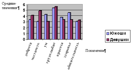 Рисунок № 4.Соотношение средних ранговых значений ценностей по методике «КИСС» у юношей и девушек по каждому показателю. На рисунке №4 мы видим, что наблюдаются различия в шкале ценностей у респондентов по представленным показателям. Для парней более значимыми в людях являются «доброта», «честность», «трудолюбие» и «общительность». Для представительниц женского пола более значимыми являются такие качества как «ум», «красота» и «здоровье».