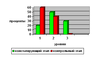 1. У детей стали преобладать такие гуманные взаимоотношения как: доброта, отзывчивость, сострадание, взаимовыручка, сопереживание. 2. Повысился уровень сформированности гуманных отношений (отсутствуют дети с третьим уровнем) 3. Появилась дифференциация гуманных отношений, дети стали подробнее и более развернуто строить свой ответ. Появились прямые обращения со словами сочувствия и утешения к пострадавшему. Сравнительный анализ результатов Для того, чтобы выяснить эффективность проведенного нами эксперимента, необходимо сравнить уровни сформированности гуманных взаимоотношений детей на констатирующем и контрольном этапе. Голограмма № 3 Динамика развития сформированности гуманных отношений детей в сюжетно-ролевых