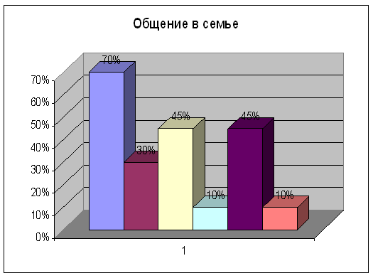 Мы провели исследование по всем четырем методикам. (Результаты исследования представлены в приложении 1). По итогам диагностики выявлены следующие данные: Из диаграммы 1 видно, что при исследовании особенностей общения и взаимоотношений в семье по методике «Общение в семье», у большинства наших испытуемых нет доверительного общения (70 %). У половины испытуемых (45 %) возникают трудности в общении и различие во взглядах супругов, треть наших испытуемых отмечает слабое взаимопонимание между супругами (30 %), в пятой части семей нет психотерапевтичности общения (10 %) и общих символов семьи (10 %). Диаграмма 1. Результаты исследования особенностей общения и взаимоотношений в супружеской паре по методике "Общение в семье"