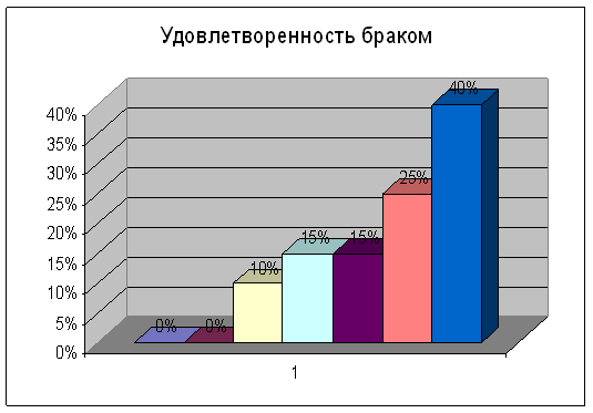 При исследовании эмоционального и морально-психологического состояния человека, находящегося в браке, большинство респондентов отмечают удовлетворенность своим браком. 40 % семей отмечают значительную удовлетворенность браком, 25 % практически полностью удовлетворены семейными отношениями. 15 % испытуемых считают, что испытывают скорее удовлетворенность, чем неудовлетворенность браком, и столько же семей отметили значительную неудовлетворенность браком. Испытывают скорее неудовлетворенность, чем удовлетворенность 10 % респондентов. Таким образом, большинство семей довольны своим браком. (См. диагр. 3). Диаграмма 3. Исследование эмоционального и морально-психологического состояния человека, находящегося в браке
