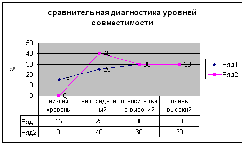 Итак, из диаграммы № 4 видно, что большинство наших испытуемых отмечают высокий уровень совместимости. Относительно высокий – 30 %, очень высокий уровень – 30 %. Четверть испытуемых считают, что уровень совместимости в их семьях неопределенный (25 %), И только 3 % считают, что в их семье уровень совместимости низкий. Таким образом, не смотря на конфликты и отсутствие взаимопонимания, большинство наших респондентов удовлетворено своим браком, и отмечает высокий уровень совместимости в своих семьях. По итогам диагностики, нам стало известно, что в супружеских парах №№ 4, 6 и 14 низкий уровень совместимости, а в парах №№ 4, 6 и 13 – значительная неудовлетворенность супружескими отношениями. Нами была проведена психокоррекционная работа с этими супружескими парами (Приложение 2). Семьи, под руководством психолога выполняли упражнения, а так же готовили домашнее задание. Через месяц занятий, которые проводились три раза в неделю, мы провели контрольную диагностику (Приложение 3). Сравнив результаты, мы увидели изменения, которые отражены в диаграммах 5 и 6. Диаграмма 5. Сравнительная диагностика совместимости брачных партнеров по методике «Совместимость с брачным партнером»