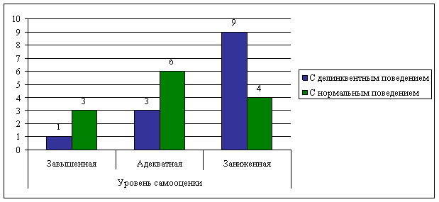 Уровень самооценки подростков делинквентного и социально приемлемого поведения У подростков с асоциальным поведением отмечена тенденция к заниженной самооценке (9 из 13). 2.3 Выводы Имеются данные о том, что акцентуция характера является фактором риска делинквентного поведения, причем различные типы акцентуаций характера не равнозначны с точки зрения их корреляции с делинквентностью. По исследуемым нами данных наиболее часто делинквентиое поведение встречается среди подростков с акцентуациями неустойчивого, эпилептоидного и истероидного типов. Можно добавить в список вышеуказанных и такой тип акцентуации, как гипертимный, который, по нашим данным, также часто встречается среди подростков-делинквентов. Особо хотелось бы подчеркнуть криминогенность эпилептоидного типа акцентуаций, который связан с повышенной агрессивностью, импульсивностью, низкой терпимостью. Несовершеннолетние преступники проявляют повышенную агрессивность на фрустрацию и склонны к межличностным конфликтам. В результате проведенного опроса подростков (о родителях) позволяют сформулировать следующие тенденции в той мере, как видят их подростки: 1. Испытывая по отношению к себе прежде всего враждебное отношение родителей (высокая враждебность), подростки приобретают опыт агрессивного поведения в семье, что является источником их высокая тревожность, что может создать неблагоприятные условия для развития ребенка и в дальнейшем построения им своей собственной жизни, не видя гармоничных отношений в семье, такому подростку, не «привиты» правильные формы поведения. Внутренняя опасность этой ситуации состоит в том, что актуально сами подростки не осознают этих проблем, на данном моменте своей жизни они оценивают отстраненность родителей как доверие к себе, отсутствие авторитарности и отвержения и приравнивают такой стиль взаимоотношений к позитивному для себя. 2. Второй крайностью родительского отношения является автономность, подростки приобретают опыт безразличных и формальных взаимоотношений. В то же время они испытывают высокую потребность в близких в психологически безопасных внутрисемейных взаимоотношениях. Внутренняя опасность этой ситуации состоит в том, что актуально сами подростки не осознают этих проблем, на данном моменте своей жизни они оценивают отстраненность родителей как доверие к себе, отсутствие авторитарности и отвержения и приравнивают такой стиль взаимоотношений к позитивному для себя. 3. Отмечаемая подростками непоследовательность воспитательных воздействий со стороны родителей способствует формированию у них, неуверенности в себе и отсутствие ощущения постоянства окружающего мира. Таким образом, очевидна ценность профилактической работы родителей с школьными педагогами, классными руководителями, психологами и социальными педагогами. Особенно важной представляется работа по формированию у родителей подростков отношения к ним как к самодостатоным личностям, имеющим сильные стороны и все необходимые возможности для достойной жизни. Необходимо повысить в глазах родителей ценность общения со своими детьми-подростками, при этом дав им понять, что существуют другие позитивные стили поведения и отношения к ребенку, а для осуществления заинтересованного взаимодействия требуется умение испытывать и пр
