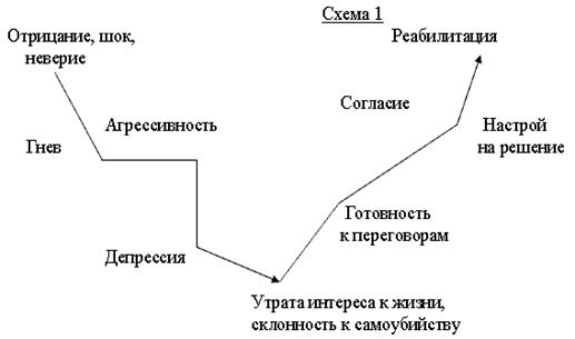 На Схеме 1 показан процесс переживания матерью ситуации рождения у нее ребенка с нарушениями развития и нахождения конструктивного решения в связи с этим. Стадии, происходящие с ее психикой аналогичны тому, что переживают люди, потерявшие близкого человека. Переживания горя имеют несколько этапов: 1. Этап. Начало горя – отказ семьи верить в действительность. Когда разум говорит, что ребенка мечты нет, все же эмоциональная связь с ребенком мечты остается. По этой причине родитель продолжает горевать. Узы разрываются, когда мечта вступает в борьбу с действительностью. Стремление вновь обрести ребенка мечты. Начало горя исполнено тоски и протеста. Мама тоскует по ребенку мечты, растеряна и не может поверить, что с ней произошло. Она мечтает, что вопреки всему, окажется, что, ребенок которого она родила, не имеет нарушений и к ней еще вернется. Ей нужна ее надежда, она взывает к окружающим, чтобы они участвовали в ее мечте. Она раздражается, и сердиться на тех, кто пытается заставить ее осознать действительность. Она к этому не готова. Тот, кто переживает горе, крайне чувствителен к окружающим. Гурли Фюр выделяет, что в этот период, она пытается понять, вспомнить события в деталях и найти смысл в том, что произошло. Она ищет «нити», которые могли бы ей объяснить, «почему это должно случиться с ней». Пока это продолжается, она как правило, не «слышит» что ей говорят. Здесь родители хватаются за надежду на супер лекарства, которые избавят от ограничения, изобретения. В общем, концентрация идет только на той информации, которая поддерживает жизнь ее мечты, а что может помешать ее вере в чудо, она избегает. Она делает упорные долгие попытки избавиться от ограничений, хотя они и бесполезны. Разочарование - когда процесс горя протекает «здоровым» образом, мама постепенно перестает думать о Ребенке своей мечты и прекращает попытки вернуть его, когда она страдает, она перерабатывает потеря и медленно привыкает к реальности. Мама убеждается в потерянном счастье, она сравнивает свою мечту с действительностью и видит, что ей не придется пережить и увидеть. Разочарований становиться все больше и на смену тоски приходит отчаяние. 1. Этап. Середина горя - борьба между мечтой и реальностью. Мама должна разрушить старую мечту и найти новую, которая будет основываться на реальности. Когда старая разрушена, а новой еще не создали, она живет в запутанном, беспорядочном хаосе, ей кажется, все рушиться, упадок депрессия мучительны. Осознание действительности влечет за собой угрозу их чувства собственного достоинства и для спокойного знакомого мира, в котором они живут. Психологическая защита не подпускает к человеку боль, беспокойство и страх. Она позволяет постепенно приспособиться к действительности, хотя и самообман. Отрицая ограничения ребенка, они пропускают только ту информацию, которую в данный момент могут вынести. Эти колебания и борьба между мечтой и действительностью приобретает разные формы: Ø Отрицание диагноза - родители не хотят верить и думают, что врач ошибся. Причины этого, родители не могут вынести все вызванные происшедшим чувства, пока не могут осознать его. А те, кто информировал родителей, не понимал, что информация должна поддаваться постепенно в такой форме, в которой ее могут принять. Фантазии о том, что ребенок обладает настоящим 
