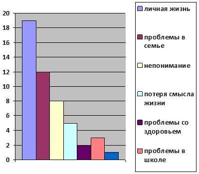 В анкете был приведён ряд вопросов, выясняющих мнение подростков о возможных причинах суицидального поведения, на основании ответов получим диаграмму (Рисунок 1):