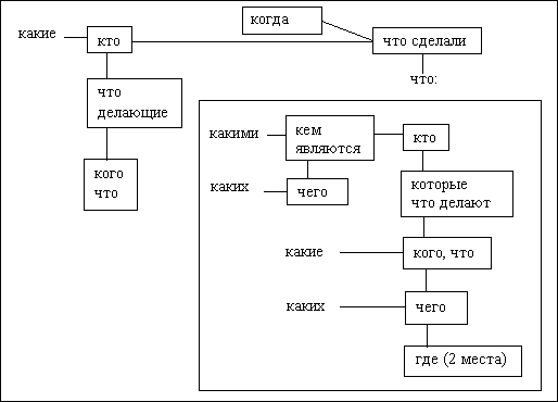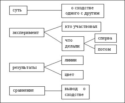 Рис. 1. 7.Анализ структуры коротких текстов. Предъявляются законченные тексты из 5—7 развернутых предложений. Например: «По мнению американских ученых, четыре-пять часов, проведенных перед телевизором, действуют на организм как несколько рюмок алкоголя. В эксперименте ученые использовали группу водителей, которые сели за руль после того, как в течение нескольких часов смотрели телевизор. В результате 9 % из них необоснованно пересекли запрещающие линии на шоссе, 20 % перепутали зеленый и красный цвета светофора. Фактически они поступали как люди, употребившие алкоголь». В процессе чтения текста составляется схема, отражающая все смысловые его части (например, рис. 2).