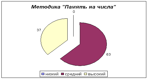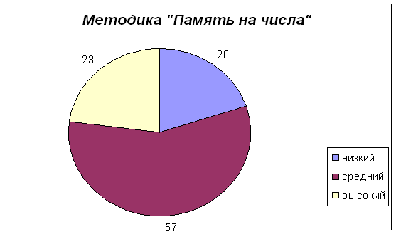 Из таблицы 1 и диаграммы на рис.1 мы видим, что в результате диагностики кратковременной зрительной памяти по методике «Память на числа», большинство шестиклассников имеют средний уровень кратковременной зрительной памяти. У шести школьников уровень памяти низкий. И семь человек имеют высокий уровень памяти по данной методике (см рис.1).