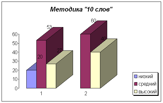 Рис.9. Результаты экспериментальной – 1, и контрольной – 2 диагностики кратковременной зрительной памяти В результате сравнительного анализа данных по методике «10 слов» мы так же видим положительную динамику у наших испытуемых. Большинство школьников имеет средний уровень памяти, увеличилось количество детей с высоким уровнем памяти (см.рис.10).