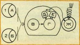 Рис. 2 Спустя несколько минут или часов следует, глядя на схему, как можно точнее воспроизвести содержание текста. Важно, чтобы все смысловые единицы текста были воспроизведены. Это упражнение развивает способность производить глубокий анализ структуры текста в процессе составления его схемы, а также точно использовать составленную схему при воспроизведении материала. 8.Составление схематических рисунков. Предъявляются искусственные сложные тексты, перегруженные информацией об отдельных элементах, связях между ними, последовательно влияющих друг на друга и т. д. Например: «Если действие первого и второго явления на третье оказывается совместным, то сочетание признака А первого явления и признака Б второго явления приводит к изменению свойства В в третьем явлении. Изменение свойства В спустя некоторое время приводит к изменению свойства Г, которое теперь немедленно порождает его признаки Д и Е, которые, взаимодействуя друг с другом, усиливаются. Это приводит к тому, что третье явление разрушительно действует на четвертое явление. Это происходит так: новые свойства Д и Е третьего явления порождают в четвертом явлении свойство Ж, которое, нарастая, приводит его к взрыву». Медленно читая текст, следует составить схематический рисунок, отражающий описанные в нем процессы (например, рис. 3). Рис. 3