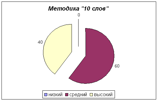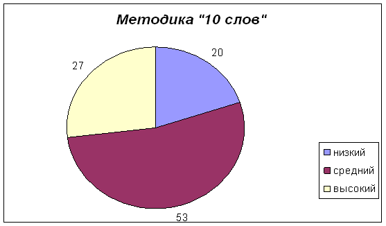 Рис.1. Результаты диагностики кратковременной зрительной памяти В результате диагностики произвольного запоминания по методике «10 слов», большинство шестиклассников так же имеют средний уровень памяти. У шести школьников уровень памяти низкий. И восемь человек имеют высокий уровень памяти по данной методике (см.рис.2).