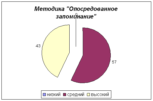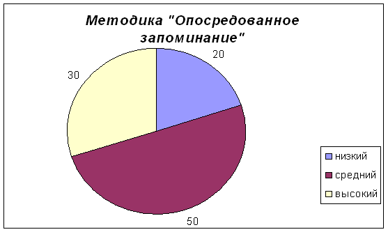 Рис.2. Результаты диагностики произвольного запоминания В результате диагностики опосредованного запоминания выяснилось, что половина школьников имеет средний уровень запоминания, у шести человек уровень запоминания низкий, и у девяти – высокий (см.рис.3).