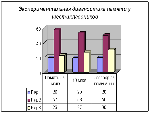 Рис.4. Сравнение результатов экспериментальной диагностики памяти у шестиклассников. Итак, из диаграммы на рис.4 мы видим, что по всем трем методикам большинство школьников имеет средний уровень памяти. Низкий уровень памяти отмечен у 20% шестиклассников. На следующем этапе исследования был проведен формирующий эксперимент. 2.3 Описание формирующего эксперимента После первичной диагностики учащихся мы провели с ними тренинг логического запоминания. Тренинг направлен на формирование и совершенствование у школьников разнообразных приемов смысловой проработки материала, составляющих основу логической памяти. Материал для эксперимента - дидактические игры и упражнения (см. приложение №2). Плохая память у школьников может обусловливаться множеством различных причин. Но чаще всего психологу приходится иметь дело со случаями, когда ребенок попросту не владеет (или недостаточно владеет) способами смыслового запоминания материала, у него отсутствуют умения и навыки их применения в учебно-познавательной деятельности. Ученики занимались ежедневно, 2-3 раза в неделю в течение месяца. Первые занятия проводились под руководством психолога, затем учащийся получал индивидуальные задания по каждому из упражнений и выполнял их в домашних условиях.http://www.voppsyl.ru/4y/ISSUES/1991/916/916083.php - _ftn2 Первоначальное становление, последующее совершенствование и заключительная автоматизация основных приемов смысловой проработки материала приводят к существенному улучшению логической памяти учащихся. При этом у некоторых из них параллельно с освоением способов логического запоминания происходит формирование отсутствовавшего прежде вкуса к умственной работе и восстановление утраченного ранее интереса к учебно-познавательной деятельности. 2.4 Контрольное исследование успешности обучения у детей подросткового возраста После окончания формирующего эксперимента мы провели контрольную диагностику мнестических процессов учащихся для оценки эффективности тренинга логического запоминания (см. приложение 3). Результаты диагностики представлены в таблице 2 и отражены графически в диаграммах. Таблица 2.