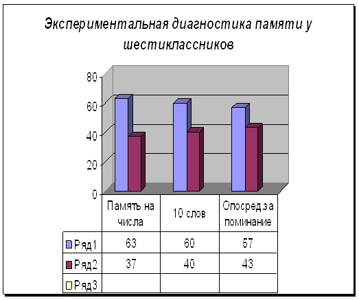 Оценка результатов. По количеству правильно воспроизведенных чисел оценивается кратковременная зрительная память на числа. Норма взрослого человека 7 ± 2. Показатель в 9 единиц и больше рассматривается как высокий, 8-6-средний, 5-4 - ниже среднего, 3 и меньше - низкий. 3. Методика. А.Н. Леонтьева. Диагностика опосредствованной памяти Материалом, необходимым для проведения методики, служат лист бумаги и ручка. Перед началом обследования ребенку говорят следующие слова: «Сейчас я буду называть тебе разные слова и предложения и после этого делать паузу. Во время этой паузы ты должен будешь на листе бумаги нарисовать или написать что-нибудь такое, что позволит тебе запомнить и затем легко вспомнить те слова, которые я произнес. Постарайся рисунки или записи делать как можно быстрее, иначе мы не успеем выполнить все задание. Слов и выражений, которые необходимо запомнить, довольно много». Ребенку последовательно одно за другим зачитываются следующие слова и выражения: Дом. Палка. Дерево. Прыгать высоко. Солнце светит. Веселый человек. Дети играют в мяч. Часы стоят. Лодка плывет по Реке. Кошка ест рыбу. После прочтения ребенку каждого слова или словосочетания экспериментатор делает паузу на 20 сек. В это время ребенок должен успеть изобразить на данном ему листе бумаги что-либо такое, что в дальнейшем позволит ему вспомнить нужные слова и выражения. Если за отведенное время ребенок не успел сделать запись или рисунок, то экспериментатор прерывает его и зачитывает очередное слово или выражение. Как только эксперимент закончен, психолог просит ребенка пользуясь сделанными им рисунками или записями, вспомнить те слова и выражения, которые ему были зачитаны. Оценка результатов За каждое правильно воспроизведенное по собственному рисунку или записи слово или словосочетание ребенок получает 1 балл. Правильно воспроизведенными считаются не только те слова и словосочетания, которые восстановлены по памяти буквально, но и те, которые переданы другими словами, но точно по смыслу. Приблизительно правильное воспроизведение оценивается в 0,5 балла, а неверное — в 0 баллов. Максимальная общая оценка, которую ребенок может получить в этой методике, равна 10 баллам. Такую оценку ребенок получит тогда, когда правильно вспомнит все без исключения слова и выражения. Минимально возможная оценка — 0 баллов. Она соответствует тому случаю, если ребенок не мог вспомнить по своим рисункам и записям ни единого слова или не сделал ни к одному слову рисунка или записи. Выводы об уровне развития 10 баллов — очень высоко развитая опосредованная слуховая память. 8-9 баллов — высоко развитая опосредованная слуховая память. 4-7 баллов — средне развитая опосредованная слуховая память. 2-3 балла — низко развитая опосредованная слуховая память. 0-1 балл — слабо развитая опосредованная слуховая память. 2.2 Анализ результатов экспериментального исследования Мы провели диагностику памяти по всем трем методикам (см. приложение 1). Данные первичной диагностики памяти мы занесли в таблицу 1 и отразили графически в диаграммах. Таблица 1.