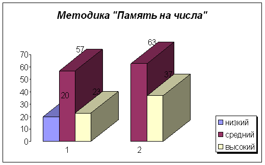 Рис.8. Сравнение результатов контрольной диагностики памяти у шестиклассников. Итак, из диаграммы на рис.8 мы видим, что после того, как с шестиклассниками был проведен тренинг логического запоминания, в результате диагностики по всем трем методикам низкий уровень не выявлен. Большинство школьников имеет средний уровень памяти. Высокий уровень памяти отмечен более, чем у трети школьников. Для наглядного сравнения результатов экспериментального и контрольного исследования мы построили диаграммы по результатам диагностики памяти по всем методикам. Из диаграммы на рис.9 мы видим, что количество школьников, имеющих средний и высокий уровень кратковременной зрительной памяти, по методике «Память на числа», увеличилось (см. рис.9).