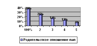 Таким образом, мы выяснили, что в опрошенной нами группе пап чаще всего встречается шкала родительского отношения «Принятие – отвержение» 38%. Тип родительского отношения пап «Кооперация» встречается реже - 25 %, тип родительского отношения пап «Авторитарная гиперсоциализация» встречается еще реже – 17%, тип родительского отношения пап «Маленький неудачник» - встречается очень редко - 13% и реже всего встречается тип родительского отношения пап «Симбиоз» - 7 %. Т.е. папе нравится ребёнок таким, какой он есть. Он уважает индивидуальность ребёнка, симпатизирует ему, стремится проводить много времени вместе с ребёнком, одобряет его интересы и планы. Полученные результаты можно изобразить графически.