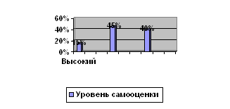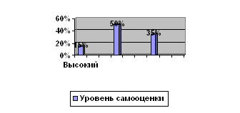 Таким образом, при обработке теста «Лесенка» получены результаты детей: высокий уровень самооценки выявлен у 15 % опрошенных, средний уровень - у 50 %, низкий уровень самооценки выявлен у 35 % опрошенных. Т.е., в группе детей, преобладает средний уровень самооценки. Полученные результаты можно изобразить графически.