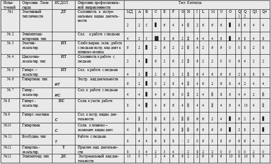 По тесту Кеттелла выявлена закономерность: ДТ – высокие показатели по фактору "О", человеку свойственна тревожность, депрессивность, ранимость, впечатлительность. - низкие показатели по фактору "Н", человек застенчив, не уверен в своих силах, сдержан, робок, предпочитает находиться в тени. Большому обществу предпочитает одного – двух людей, друзей. Отличается повышенной чувствительностью к угрозе. ИТ - высокие показатели по фактору "В", отличительные качества: абстрактность мышления, сообразительность, быстрая обучаемость. Существует некоторая связь с уровнем вербальной культуры и эрудицией. - низкие показатели по фактору Н", тревожность, депрессивность, ранимость, впечатлительность. - низкие показатели по фактору "Н", человек застенчив, не уверен в своих силах, сдержан, робок, предпочитает находиться в тени. Большому обществу предпочитает одного – двух людей, друзей. Отличается повышенной чувствительностью к угрозе. ИС - высокий показатель фактора "В" отличительные качества: абстрактность мышления, сообразительность, быстрая обучаемость. Существует некоторая связь с уровнем вербальной культуры и эрудицией. - низкий показатель фактора "Н", человек застенчив, не уверен в своих силах, сдержан, робок, предпочитает находиться в тени. Большому обществу предпочитает одного – двух людей, друзей. Отличается повышенной чувствительностью к угрозе. - низкий показатель фактора "М", человек практичный, добросовестный. Он ориентируется на внешнюю реальность и следует общепринятым нормам, ему свойственна некоторая ограниченность и излишняя внимательность к мелочам. - низкий показатель фактора "Q4", человеку свойственна расслабленность, вялость, спокойствие, низкая мотивация, леность, излишняя удовлетворенность и невозмутимость. ДС - высокий показатель МD, человеку свойственно завышать самооценку. - низкий показатель по фактору "С", низкий показатель толерантности по отношению к фрустрации, подверженность чувствам, переменчивость интересов, склонность к лабильности настроения, раздражительность, утомляемость, невротические симптомы, ипохондрия. Би – С высокие показатели фактора "О", человеку свойственна тревожность, депрессивность, ранимость, впечатлительность. - высокий показатель по фактору "Q4", свидетельствует о напряженности, фрустрированности, в которой человек находится, представляет собой результат повышенной мотивации. Ему свойственна активное неудовлетворение стремлений. Би –Т низкий показатель фактора "G", человек не постоянен, подвержен влиянию случая и обстоятельств, не делает усилий по выполнению групповых требований и норм. Он характеризуется беспринципностью, неорганизованностью, безответственностью, гибкими установками по отношению к социальным нормам, что может привести к атисоциальному поведению. Приложение № 4 Опросник "Индивидуальный стиль деятельности, опосредованный латеральностью" — ИСДОЛ В.И. Терентьева ИНСТРУКЦИЯ Предлагаем Вам ряд высказываний об особенностях деятельности и поведения. Последовательно прочитав каждое высказывание, выберите один из возможных ответов: "Верно", "Неверно" и поставьте соответствующий ответу знак. Не пропускайте ни одного высказывания. Помните, что не может быть хороших или плохих ответов, так как это не испытание Ваших способностей, а лишь выявление индивидуального сво