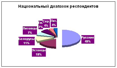 Образовательный уровень респондентов: Образовательный уровень среди женщин следующий: Высшее образование - 5 человек, из которых, 4 русские и 1 эстонка. Незаконченное высшее - 6 респондентов, из которых, 2 русских, 1 эстонка, 2 белоруса, 1 еврей. Средне-специальное образование - 2 человека, из которых, 1 сербка, 1 украинка. Образовательный уровень среди мужчин следующий: Высшее образование - 8 человек. Незаконченное высшее - 3 респондентов. Средне-специальное образование - 2 человека, из которых, 1 еврей, 1 украинец. Национальный диапазон: Национальный разброс был следующим: 14 - русских, 5 - эстонцев, 3 - белорусов, 2 - литовца, 2 - еврея, 2 - украинца, 1 - латвиец, 1 - серб.