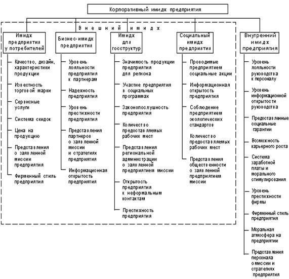 Бизнес-имидж предприятия складывается из представлений партнеров о предприятии как субъекте определенной деятельности. В качестве основных детерминант бизнес-имиджа выступают: деловая репутация, или добросовестность (соблюдение этических норм бизнеса) в осуществлении предпринимательской деятельности, надежность, лояльность предприятия к партнерам, информационная открытость, а также деловая активность предприятия, индикаторами которой являются объем продаж, относительная доля рынка, разнообразие товаров, гибкость ценовой политики. Социальный имидж предприятия — представления широкой общественности о социальных целях и роли предприятия в экономической, социальной и культурной жизни общества. Социальный имидж формируется посредством информирования общественности о социальных аспектах деятельности предприятия, таких как спонсорство, меценатство, поддержка общественных движений, участие в решении проблем экологии, занятости, здравоохранения и т.д., содействие конкретным лицам. Имидж предприятия для госструктур составляют представления о предприятии представителей региональной администрации, исполнительной и законодательной власти. Параметрами имиджа для госструктур являются: значимость продукции предприятия для региона, степень участия предприятия в региональных социальных программах, выполнение предприятием федеральных и региональных законов, количество предоставляемых рабочих мест для жителей региона, открытость предприятия к неформальным контактам. Внутренний имидж предприятия формируют представления персонала о своем предприятии. Персонал при этом рассматривается не только как фактор конкурентоспособности предприятия, одна из ключевых групп общественности, но и как важный источник информации о предприятии для внешних аудиторий. Основными детерминантами внутреннего имиджа являются культура предприятия (система подбора и обучения персонала, система отношений руководства и подчинения, система оценки работы персонала на основании принятых на предприятии критериев, система вознаграждений, система социальных льгот, фирменный стиль предприятия) и социально-психологический климат (настроение и мнение коллектива, индивидуальное самочувствие и оценка условий жизни и работы личности в коллективе). Корпоративный имидж выступает как один из инструментов достижения стратегических целей предприятия, затрагивающих основные стороны его деятельности и ориентированных на перспективу. Преимущества позитивного имиджа очевидны. Однако позитивная известность не появляется сама собой и не существует сама по себе. Она требует целенаправленной систематической работы, связанной с превращением реального имиджа предприятия в позитивный. В таблице №1 представлена структура корпоративного имиджа и элементы каждой структурной единицы. Таблица №1