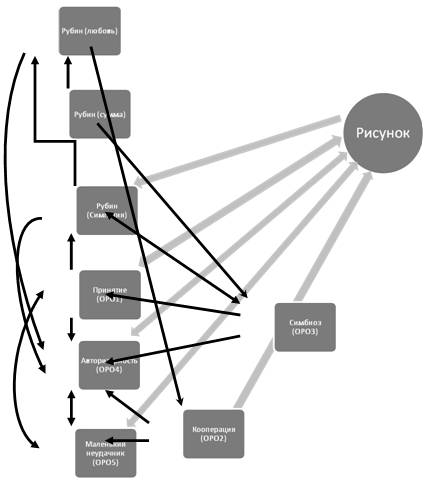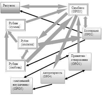 Рисунок 2. Структура связей детско-родительских отношений в группе нормы. Теперь рассмотрим рисунок №2. Здесь наблюдается два доминирующих центра. Первое - это "ОРО3-симбиоз" и второе, "Рубин-симпатия, Рубин-любовь". "Симбиоз" взаимно связан с "рисунком", шкалой "кооперация" и влияет на "Рубин-симпатия" и шкалу "авторитарность". В свою очередь, "Рубин – любовь" влияет на "симбиоз", а "Рубин-симпатия" на шкалу "кооперация". Из вышесказанного можно предположить, что во главе семейной системы стоит любовь родителей и сильное стремление взрослых не отпускать от себя ребёнка, ощущать себя с ним единым целым, стремится удовлетворить любую его потребность, оградить от трудностей и неприятностей в жизни. Если сравнить группы, то структура связей существенно различны. Т.к. доминирующим центром в логопедической группе является "рисунок", а в группе нормы шкалы "Рубин-симпатия, Рубин –любовь" и "Симбиоз", что говорит, о противоположно разной иерархии, построении детско-родительских отношений и межличностных отношений в супружеской паре. Далее перейдём к разработке в рамках данного диплома программы оптимизации детско-родительских отношений у детей с общим недоразвитием речи: Использование игры в психологической практике получило название игротерапия. По определению М. И. Чистяковой игровая терапия – это метод психотерапевтического воздействия на детей и взрослых с использованием игры. В его основе лежит признание того, что игра оказывает сильное влияние на развитие личности. Цель использования игровой терапии – не менять и не переделывать ребенка, не учить его каким-то специальным поведенческим навыкам, а дать возможность "прожить" в игре волнующие его ситуации при полном внимании и сопереживании взрослого. Задачи игровой терапии: коррекция поведенческих проблем, снятие повышенной тревожности, развитие позитивной Я-концепции, обретение веры в себя, овладение чувством контроля. 1. Если в качестве критерия выдвинуть теоретический подход, то можно выделить виды: · игротерапию в психоанализе (игра в психоаналитической практике рассматривалась как символическая деятельность, в которой ребенок, будучи свободен от давления и запретов со стороны социального окружения с помощью игрушек, игровых действий с ними и ролей, выражает в особой символической форме бессознательные импульсы и влечения) ·игротерапию, центрированную на клиенте (главное, для игротерапии центрированной на клиенте не менять и не переделывать ребенка, не учить его каким-то специальным поведенческим навыкам, а дать ему возможность быть самим собой, создаются оптимальные условия для роста и развития. Терапевт концентрирует все свое внимание и профессиональное мастерство, слышит, чувствует и понимает любые эмоциональные состояния ребенка и отражает их) ·примитивную игротерапию (данная игротерапия рассчитана на помощь детям в их интеллектуальном, эмоциональном, физическом и социальном развитии, предоставив им соответствующие возможности обучения) ·игротерапию в отечественной психологической практике (основным принципом игровой коррекции терапии, по мнению отечественных психологов является воздействие на ребенка с учетом специфичности обстановки и контакта. Суть этого принципа заключается в следующем: чтобы включить в действие механизм перестройки поведения роб