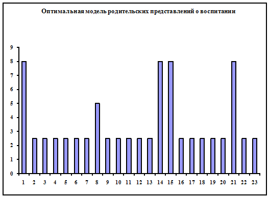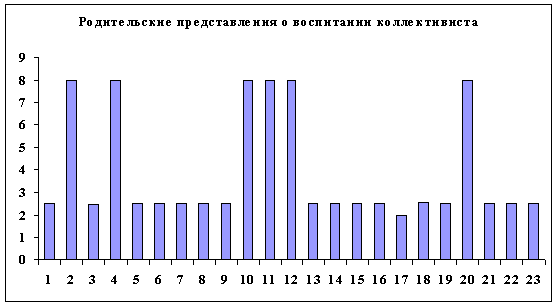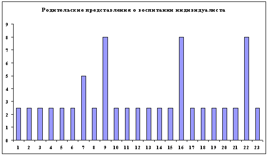 1. Стремление к риску 2. Социальный порядок 3. Независимость 4. Семейная безопасность 5. Выбор собственных целей 6. Чувство сопричастности, совместности 7. Разнообразие жизни 8. Самодисциплина 9. Яркость впечатлений 10. Гордость родителями и старшими 11. Наслаждение 12. Уважение традиций 13. Амбиции 14. Принятие своего места в жизни 15. Способности (компетентность) 16. Помощь другому 17. Авторитет, влиятельность 18. Лояльность 19. Влияние 20. Истинная дружба 21. Значимое социальное положение 22. Равенство 23. Благосостояние 24. Защита окружающей среды (Нечетные номера – индивидуалистические ценности, четные - коллективистские) Приложение 6 (таблица родительских представлений о воспитании детей)