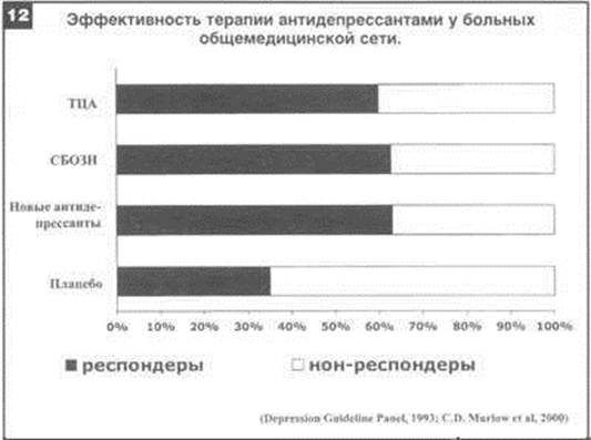 депрессий. Тем не менее, только 50-63% больных можно отнести к респондерам, а у