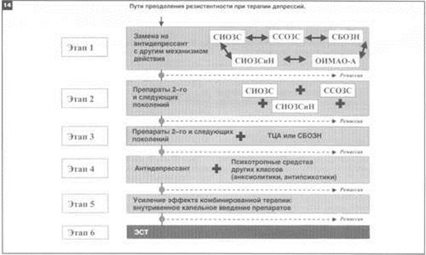этапе к одному из них присоединяются ТЦА или СБОЗН; на четвертом - психотропные