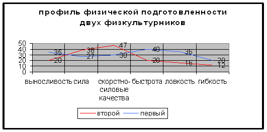 4. Построить профиль физической подготовленности двух физкультурников по результатам, показанных в тестах: на выносливость – первый-20 очков, второй-35; силу – 38, 27 очков соответственно; скоростно-силовые качества – 47, 30 очков; быстроту – 20, 40 очков; ловкость – 16, 36 очков; гибкость – 12, 20 очков
