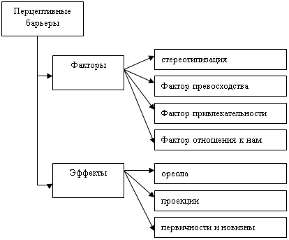 Выделяют факторы, которые действуют при формировании первого впечатления о незнакомом человеке: факторы превосходства, привлекательности, отношения к нам, а также стереотипизация. Их объединяет то, что человек в начале восприятия выделяет наиболее важные для него в тот момент характеристики собеседника, и в действие вступают соответствующие факторы. Восприятие относительно более важных на тот момент характеристик точнее, чем остальных черт, возможны ошибки (их переоценка или недооценка). Стереотипизация в большей или меньшей степени действует практически всегда. Всю информацию о собеседнике человек вначале получает непосредственно при восприятии и в основе его суждений лежит обычно накопленный опыт общения. Эффекты действуют после факторов. Выделяют эффекты ореола, проекции, первичности и новизны и многие другие. Их основное отличие в том, что эффекты действуют на основе какой-либо имеющейся первичной информации о собеседнике, ранее существовавшего конкретного образа (не обязательно верного). Например, человек уже определился, приятен ему собеседник или нет. В процессе социального восприятия эффект "ореола" весьма схож со стереотипом. Однако если при стереотипизации личность рассматривается в рамках ее социальной категории, то эффект "ореола" сказывается в восприятии личности на основе одной из ее черт. Возникновение ошибок восприятия заложено в природе человека, от них не застрахован никто. Стереотипы возникают в результате стремления упростить общение, с определенной долей вероятности спрогнозировать поведение собеседника, уменьшить неопределенность и создать правила поведения. Все-таки, в основе стереотипов лежат многочисленные наблюдения. И в некоторых случаях, когда целью общения является дело, стереотипизация позволяет повысить эффективность общения. Например, при деловом общении, ведении переговоров на первом месте стоит дело, ради которого и ведутся переговоры, глубокое познание личностей и качеств собеседников не является основной целью. Частями стереотипа являются внешний вид, манера поведения — в данном случае это деловой этикет: своеобразные "правила игры". Не прислушиваться к ним неразумно: в этом случае, скорее всего вы произведете негативное впечатление. Заключение На основании данной контрольной работы можно сделать следующие выводы: 1. Деловое общение выполняет контактную, инструментальную, интегративную и информативную функции. Деловое общение имеет три стороны своего развития — перцептивную, коммуникативную и интерактивную. Процесс общения начинается с восприятия. Существуют перцептивные барьеры, мешающие правильному восприятию. Чтобы свести их влияние к минимуму, их необходимо знать. 2. Основными механизмами взаимопонимания в процессе межличностного общения являются идентификация, эмпатия, аттракция, рефлексия. Использование этих механизмов позволяют лучше понимать собеседника, отчетливее представлять, как он реагирует на ваши слова и действия, предугадать его дальнейшие действия и правильно выстроить свое поведение. 3. Перцептивные барьеры делятся на факторы и эффекты. В процессе общения сначала действуют факторы, затем на их основе возникают эффекты. И те, и другие могут привести к неправильному восприятию. Стереотипы позволяют упростить общение, однако до определенно