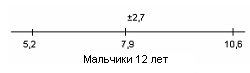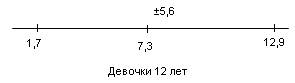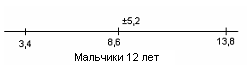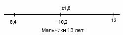 Рис.20 Показатели варьируются от 5,2 до 10,6. У испытуемых девочек в возрасте 13 лет М = 9,4, σ = 2,4(рис.21); у мальчиков 13 лет М = 9,4, σ = 1,8(рис.22).