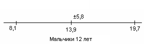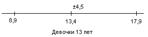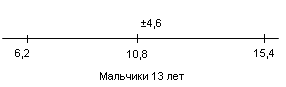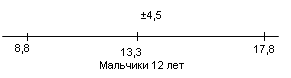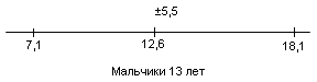 Рис.2 Показатели варьируются от 8,1 до 19,7. У испытуемых девочек в возрасте 13 лет М = 13,4, σ = 4,5(рис.3); у мальчиков 13лет М = 12,6, σ = 5,5(рис.4).