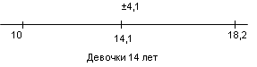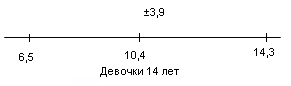 Рис.10 Показатели варьируются от 6,2 до 15,4. У испытуемых девочек в возрасте 14 лет М = 10,4, σ = 3,9(рис.11); у мальчиков 14 лет М = 9, σ = 3,9 (рис.12).