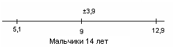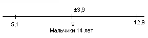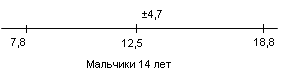 Рис.4 Показатели варьируются от 7,1 до 18,1. У испытуемых девочек в возрасте 14 лет М = 14,1, σ = 4,1(рис.5); у мальчиков 14 лет М = 12,5, σ = 4,7(рис.6).